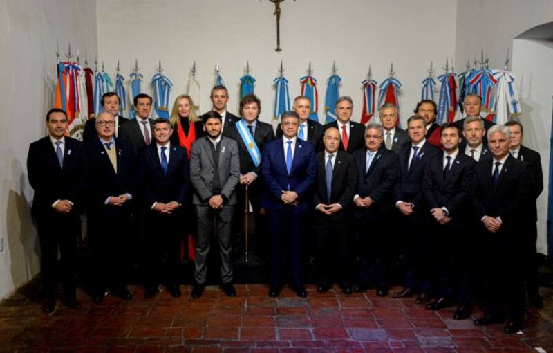 Pacto de Mayo: "Quiero convocar tanto a gobernadores como expresidentes y líderes de los principales partidos políticos, a que depongamos nuestros intereses personales y nos encontremos el próximo 25 de mayo, en la provincia de Córdoba, para la firma de un nuevo contrato social llamado pacto de mayo: un contrato social que establezca los 10 principios del nuevo orden económico argentino. EN MARCHA. No se firmó en mayo, sino que fue el 9 de Julio en Tucumán. El vínculo con los gobernadores continuó siendo uno a uno y no se avanzó de manera directa con las propuestas.