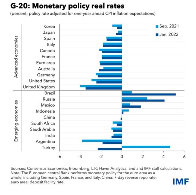 Algunas economías emergentes y en desarrollo ya se han visto obligadas a combatir la inflación elevando las tasas de interés. Y el pivote de la política en las economías avanzadas puede requerir un endurecimiento adicional en una gama más amplia de países. En ese marco, el FMI marca el atraso de las tasas reales en la Argentina, en línea con uno de los ejes del acuerdo que negocia Martín Guzmán.