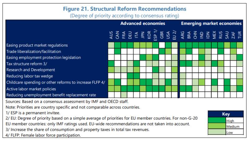 Pero en total, el informe de vigilancia del G20 considera que la mayoría de los países del grupo debe abordar reformas. Para la Argentina propone 7 puntos de reforma, con distintos grados de prioridad, la mayoría dirigidas al mercado laboral.
