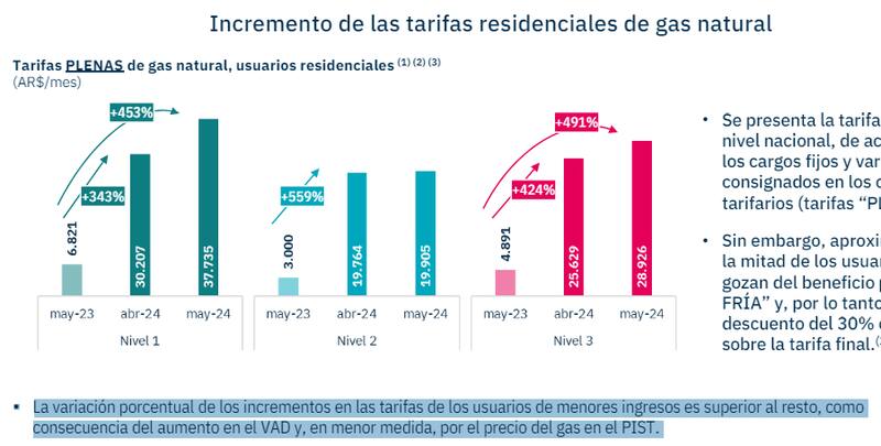 En los usuarios residenciales, los incrementos en las tarifas finales en el mes de abril estarán en torno al 343% para los usuarios de Nivel 1, al 559% para los hogares de ingresos bajos (Nivel 2) y del 424% para los de ingresos medios (Nivel 3).