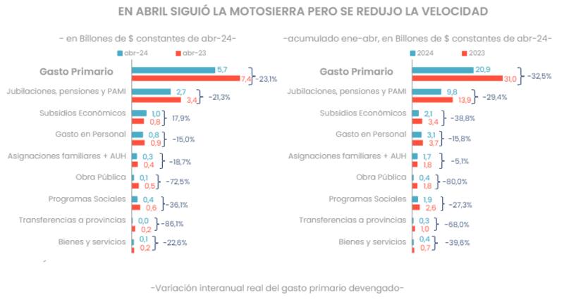 Según un análisis de la consultora Analytica, en abril, el gasto primario real devengado tuvo una caída mensual del 23,1% interanual. Entre las partidas devengadas con mayores ajustes reales respecto a abril 2023 figuran las transferencias a provincias (-86,1%), la obra pública (-72,5%), y las transferencias a programas sociales (-36,1%).