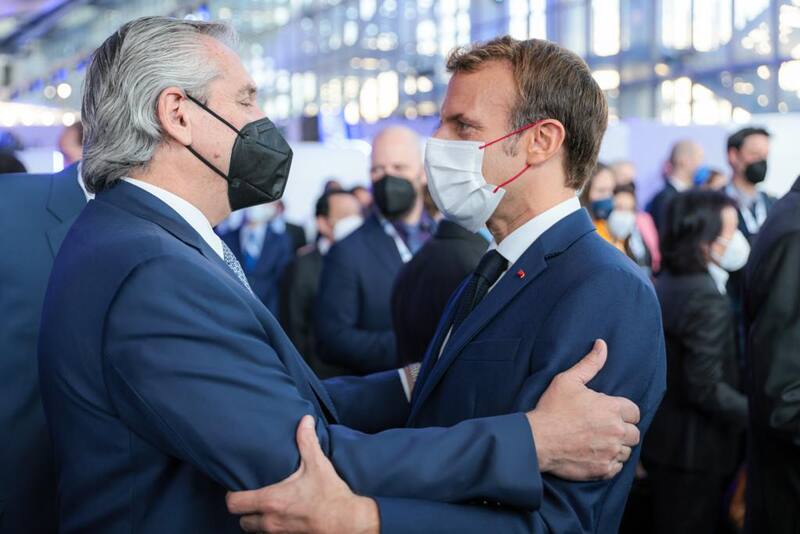 También mantuvo un saludo con Emmanuel Macron, con quien compartirá una bilateral esta tarde después de Merkel y antes del encuentro con Kristalina Georgieva.