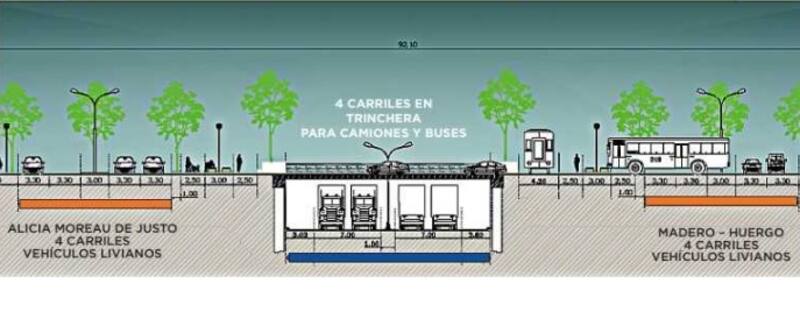 Al cruzar la avenida Belgrano, la traza de la trinchera se desviará para ubicarse parcialmente debajo de Alicia Moreau de Justo, trayecto donde la trinchera será mayormente cubierta y semicubierta hasta la avenida Córdoba. La traza continuará por un falso túnel que se creará a la altura de la Dársena Norte, sobre cuya cubierta se levantarán espacios verdes.