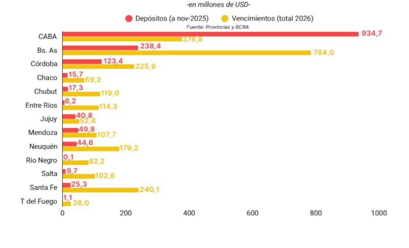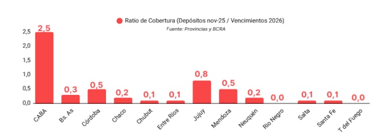 La Ciudad de Buenos Aires aparece completamente despegada del resto. Tiene U$S 934,7 millones depositados frente a vencimientos por U$S 376,8 millones, lo que implica una ratio de cobertura de 2,5 veces: le sobran dólares para afrontar todo 2026 sin necesidad de refinanciar ni salir al mercado.