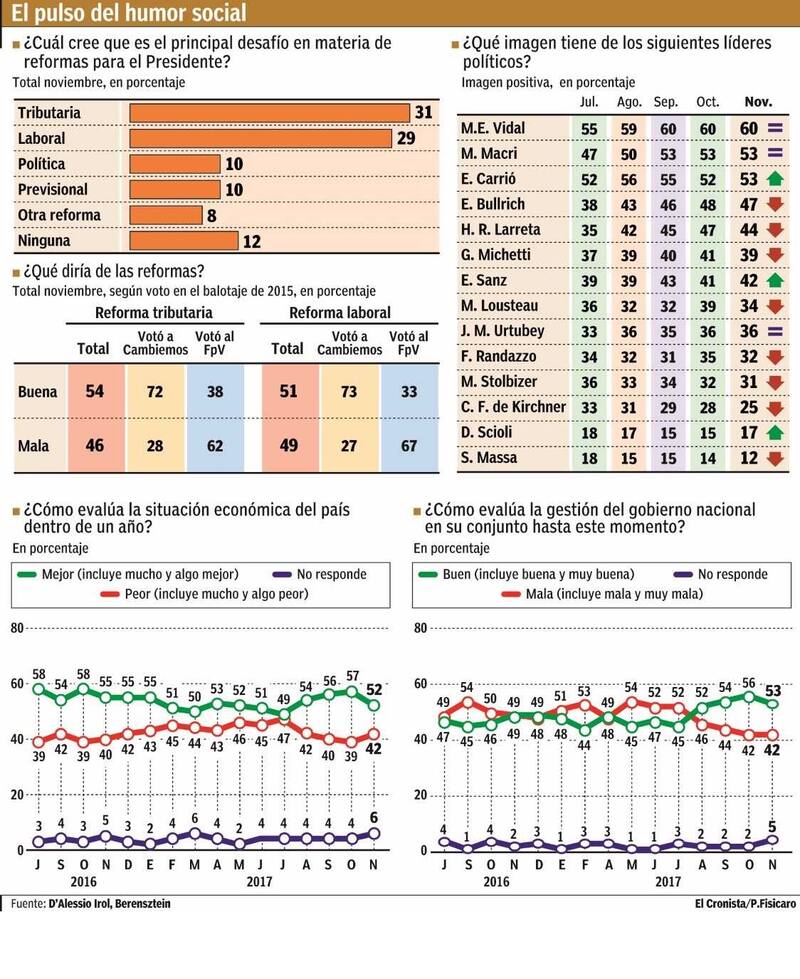 Si bien la imagen de los principales referentes del oficialismo se mantiene estable y la de opositores como Cristina Kirchner y Sergio Massa profundizan su deterioro, el lanzamiento de la etapa de "reformismo permanente", como la denominó el presidente Mauricio Macri, marcó a su vez un leve retroceso en la calificación de la gestión del Gobierno, que cedió tres puntos de la buena nota hasta quedar en 53%, aunque mantuvo la mala en solo 42%.