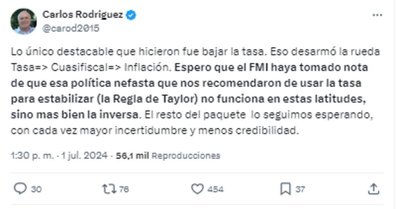 "Lo único destacable que hicieron fue bajar la tasa. Eso desarmó la rueda Tasa=> Cuasifiscal=> Inflación. Espero que el FMI haya tomado nota de que esa política nefasta que nos recomendaron de usar la tasa para estabilizar (la Regla de Taylor) no funcionaen estas latitudes, sino más bien la inversa", sostuvo el economista Carlos Rodríguez.