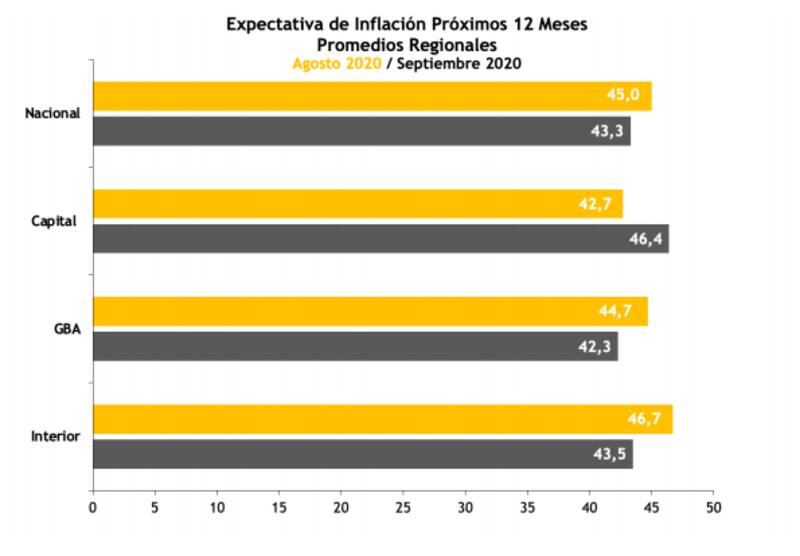 La mediana de 40% se replica tanto en Capital Federal como en Gran Buenos Aires y el interior, pero el promedio de expectativas apunta a una inflación de 43,3% para los próximos 12 meses, 1,7 puntos porcentuales (p.p.) menos que el 45% de agosto.