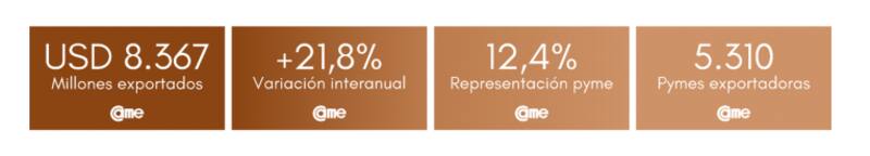 Las exportaciones de las pequeñas y medianas empresas argentinas mantuvieron un buen ritmo de crecimiento entre enero y octubre de 2024. Según el Monitor de Exportación Pyme (MEP) de la Confederación Argentina de la Mediana Empresa (CAME), las ventas al exterior crecieron un 21,8% en dólares, alcanzando los u$s 8.367 millones, lo que representó el 12,4% del total exportado por el país. En volumen, las pymes exportaron 7,2 millones de toneladas, un 30% más que en el mismo período de 2023.