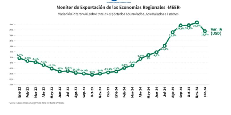 Según el Monitor de Exportaciones de las Economías Regionales (MEER) elaborado por la Confederación Argentina de la Mediana Empresa (CAME), las exportaciones de las economías regionales argentinas experimentaron un crecimiento del 23,8% en dólares y del 25,7% en toneladas en diciembre pasado. Este aumento representa una suba interanual de u$s1.684,3 millones en el total exportado y de 1,5 millones de toneladas en el volumen comercializado. El precio promedio de exportación se ubicó en u$s1.191 por tonelada, evidenciando una disminución del 1,5% respecto al año anterior, atribuida a la caída de los precios internacionales.