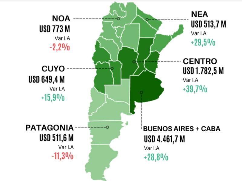 La región Centro, que incluye las provincias de Córdoba, Entre Ríos y Santa Fe, exportó u$s1.782,5 millones, representando el 20,4% de las ventas al exterior del país. Córdoba lideró con u$s870,5 millones. Comparado con el mismo período del año anterior, el comercio internacional de la región mostró un aumento del 39,7%, el más alto entre las regiones analizadas. El complejo manisero fue el más representativo, con exportaciones por u$s1.086,8 millones, lo que significó el 60,9% del total regional.