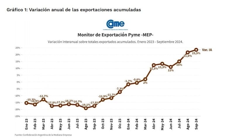 Las exportaciones de las pymes crecieron 23,5%, alcanzando los US$ 7.369 millones, lo que representa el 12,2% del total exportado por la Argentina en el período enero-septiembre 2024.