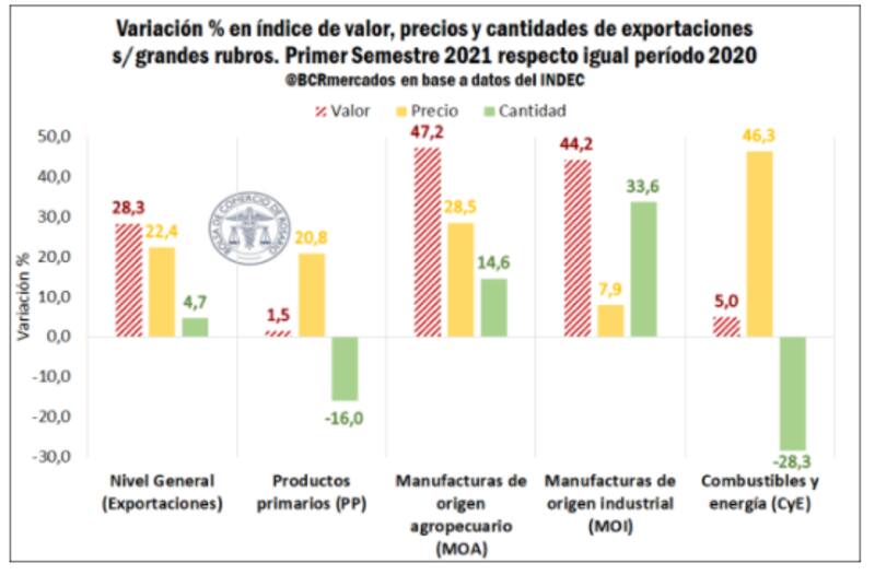 Si se analiza el valor exportado rubro por rubro, las manufacturas de origen agropecuario (MOA) tuvieron un avance de 47,2%, los productos primarios del 1,5% y las manufacturas de origen industrial (MOI) de 44,2%.
