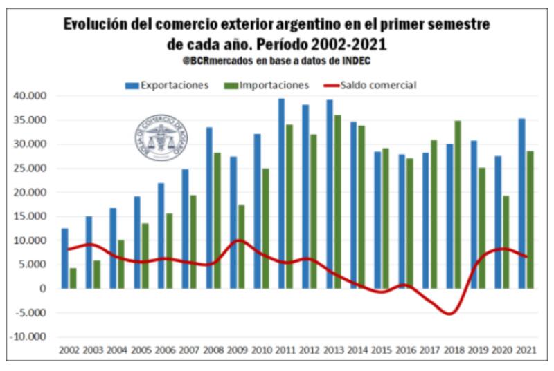 "Si se analiza la evolución del balance comercial en el primer semestre de cada año, luego de fuertes déficit con el exterior entre 2017 y 2018, se logró retomar el superávit comercial en los años siguientes. No obstante, en los años 2019 y 2020 tal situación se alcanzó, pero no gracias a una suba de las exportaciones, sino a costa de una fuerte recesión económica que resintió el consumo de todo tipo de bienes incluyendo los importados", señaló el informe de la BCR.