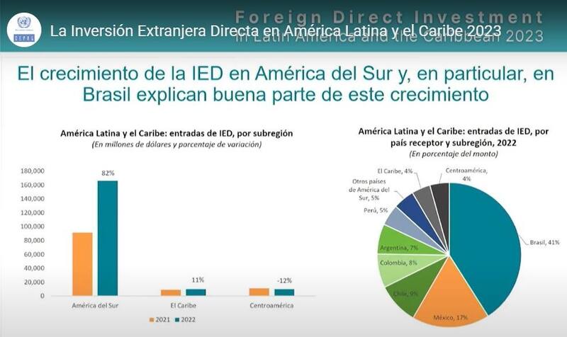 De acuerdo con el informe, casi todos los países de América Latina y el Caribe recibieron más inversión extranjera directa en 2022, sin embargo, el caso de Brasil, que recibió un 41% del total regional y que figura como quinto destino de la IED mundial, se distanció del segundo en la región, México (17%).