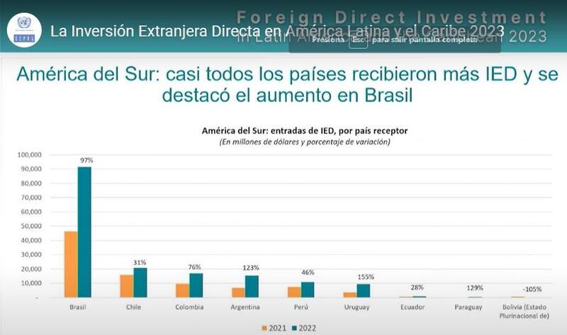 La dinámica respondió a la recuperación pospandemia pero "no es claro si se mantendrá en niveles similares en 2023", advirtió el informe "La Inversión Extranjera Directa en América Latina y el Caribe 2023"y destacó que, desde 2013 las entradas de IED en la región no superaban los 200.000 millones de dólares.