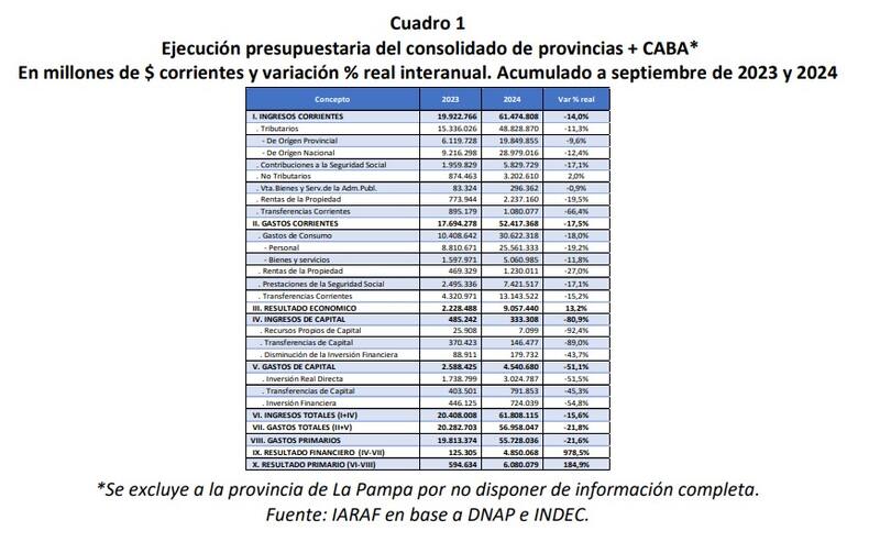 Los ingresos de las provincias cayeron en un 14% real interanual en los primeros nueve meses de 2024 mientras que los gastos corrientes cayeron un 17,5%. Esto derivó en que mejorara el resultado fiscal de los estados subnacionales y el superávit primario tuviera un aumento del 185%.