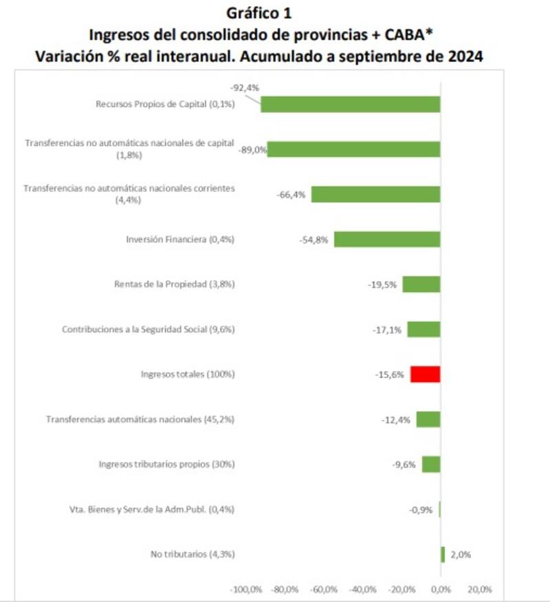 IARAF observó que los ingresos corrientes en las 23 jurisdicciones cayeron un 14% en los primeros 9 meses de 2024, mientras que los ingresos de capital se desplomaron un 81%, lo que arrojó una caída de ingresos totales del 15,6% real interanual.