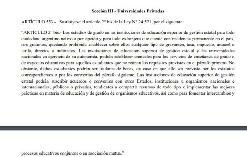 Dentro de los 664 artículos en 163 páginas, aparece este arancelamiento en institutos y universidades nacionales para extranjeros sin residencia permanente en Argentina. Las reformas en el sistema educativo se encuentran bajo el título VII-"Capital Humano" (cartera conducida por Sandra Pettovello).