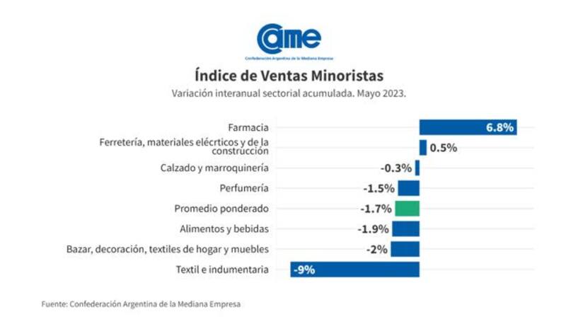 El único rubro con crecimiento anual en mayo fue Farmacias (+6,4%), y entre los ramos en baja, el de mayor retracción fue Indumentaria y textil (-8,2%).