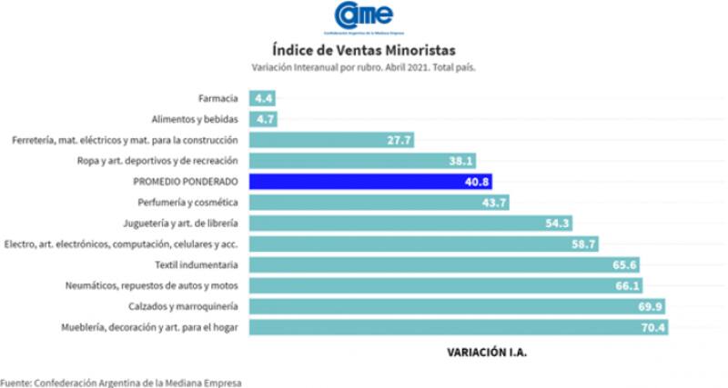 El rubro Textil e indumentaria, observó un incremento interanual de 65,6% "pero aún están 64,1% debajo de abril 2019" y el rubro Ferretería, materiales eléctricos y materiales para la construcción tuvo un ascenso anual de 27,7%, pero registra aún una caída de 22,7% si se lo compara con 2019