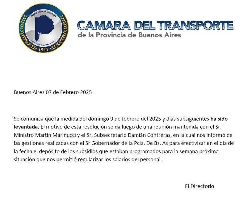 La Cámara de Transporte de la Provincia de Buenos Aires (CTPBA)levantó el paro de colectivos anunciado para el próximo domingo desde la 00, luego de que la Provincia depositara el dinero de los subsidios en las últimas horas.