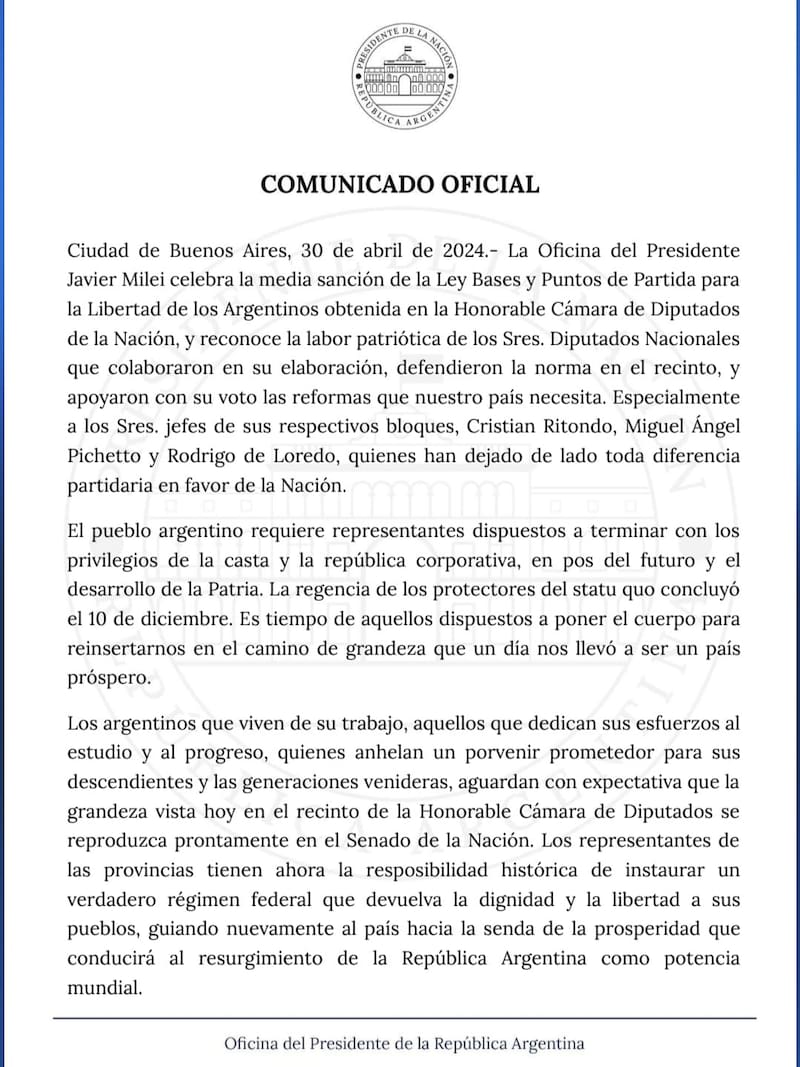 La Oficina del Presidente envió en los últimos minutos un comunicado en el que celebra la aprobación en general de la Ley Bases.