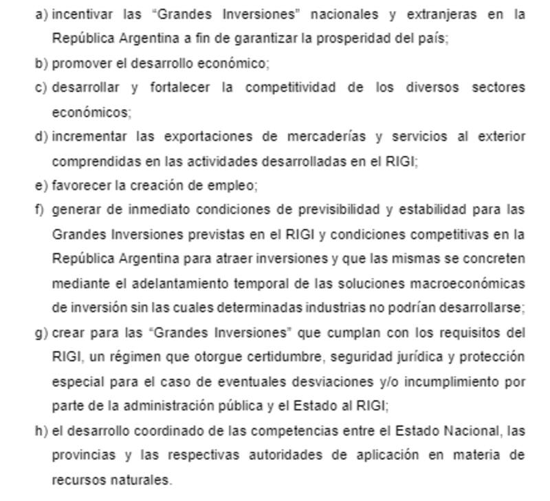 - Régimen de Incentivos para las Grandes Inversiones (RIGI). Solo admite proyectos que involucren un monto de inversión igual o superior a u$s 200 millones. A ellos se les ofrece un amplio menú de beneficios fiscales, aduaneros y cambiarios. Sectores de la oposición dialoguista pretenden que también las PyME puedan ingresar en este régimen con un monto de inversión menor.