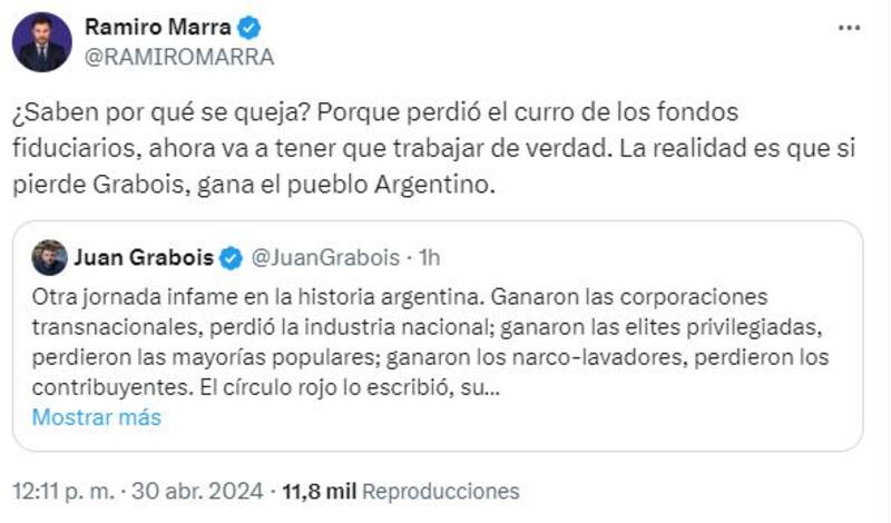 A los pocos minutos, el legislador libertario salió a responderle: "¿Saben por qué se queja? Porque perdió el curro de los fondos fiduciarios, ahora va a tener que trabajar de verdad. La realidad es que si pierde Grabois, gana el pueblo Argentino".