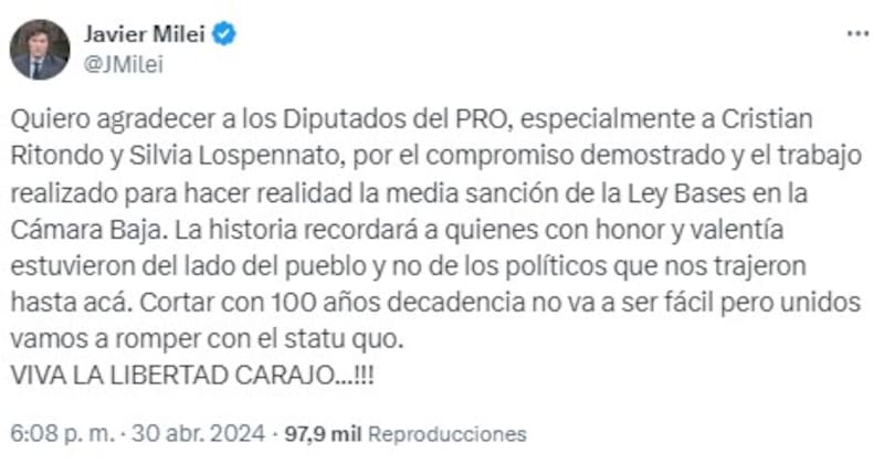 "Quiero agradecer a los Diputados del PRO, especialmente a Cristian Ritondo y Silvia Lospennato, por el compromiso demostrado y el trabajo realizado para hacer realidad la media sanción de la Ley Bases en la Cámara Baja", escribió el presidente en su cuenta de X.