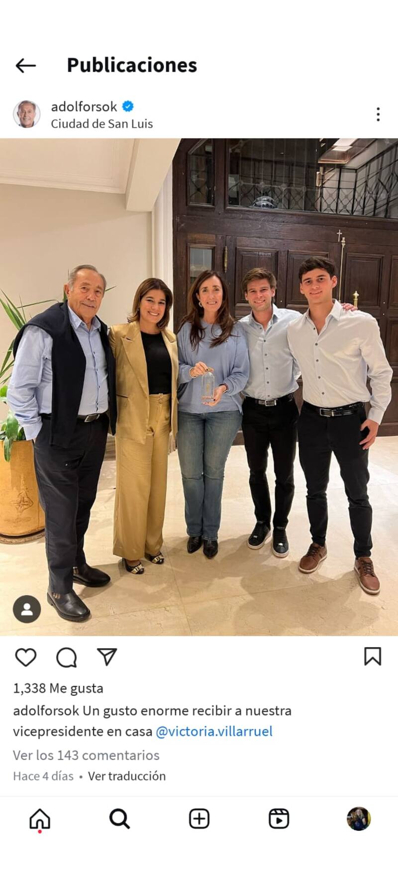 Pragmático y aliado con Poggi en contra de su propio hermano Alberto Rodríguez Saá, 'El Adolfo' recibió a la Vicepresidenta en su residencia de Potrero de los Funes. La invitó a través de un tercero y fue un muy amable anfitrión junto a su esposa Gisela Vartalitis y sus hijastros Jerónimo y Joaquín Venturini, ambos jugadores de polo, empresarios pymes y admiradores de la visitante. Lo expresaron efusivamente en las redes sociales. En la foto que compartieron en redes ella muestra una botella de agua de la pyme de uno de los jóvenes, Ouro Land Premium Water.