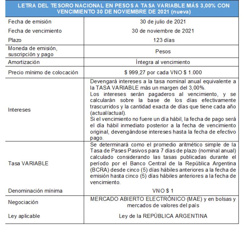 - d) Letra del Tesoro Nacional en pesos a tasa variable más 3% con vencimiento 30 de noviembre de 2021 (nueva);