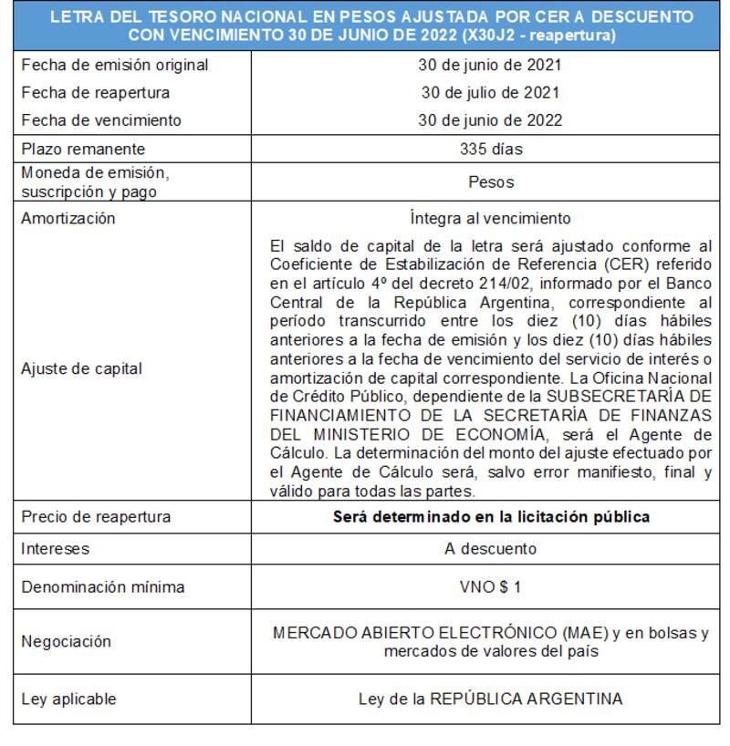 - y g) Letra del Tesoro Nacional en pesos ajustadas por cer a descuento con vencimiento 30 de junio de 2022 (x30j2 - reapertura).