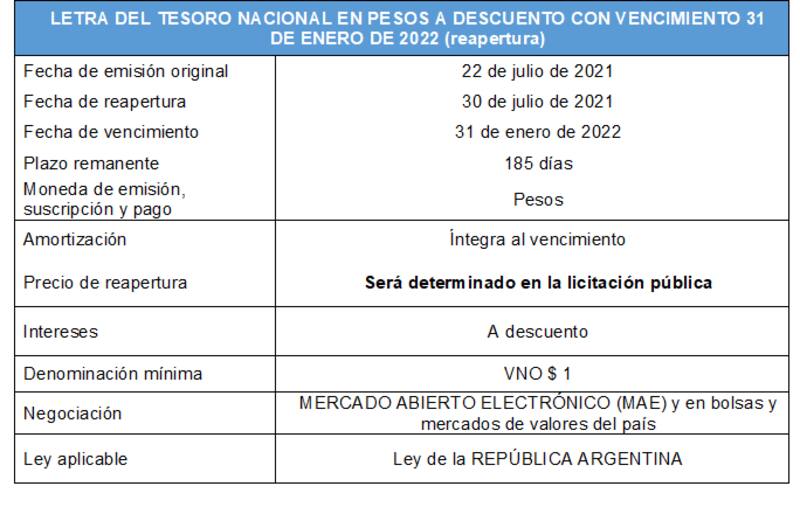 La oferta incluye Letras del Tesoro Nacional (Letes) con vencimiento el 30 de septiembre, una a descuento, y otra a tasa variable más el 2%. También habrá otras dos Letes con cierre el 30 de noviembre, una a descuento, y otra a tasa variable más 3%.