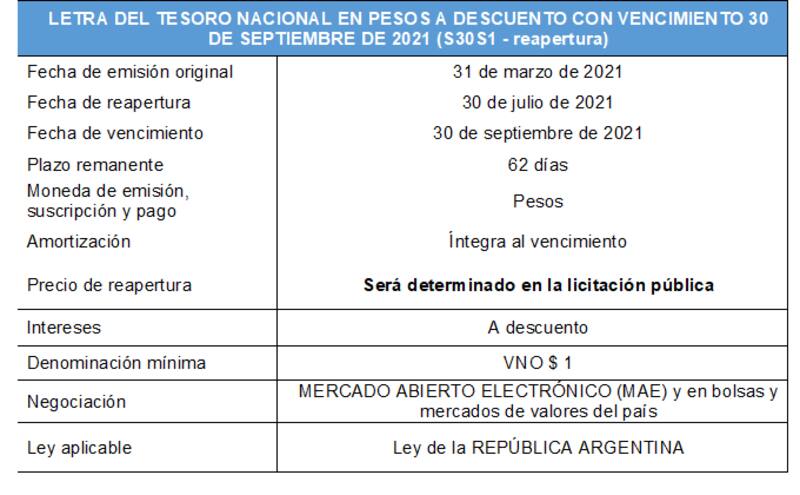 - a) Letra del Tesoro Nacional en pesos a descuento con vencimiento 30 de septiembre de 2021 (s30s1 - reapertura);