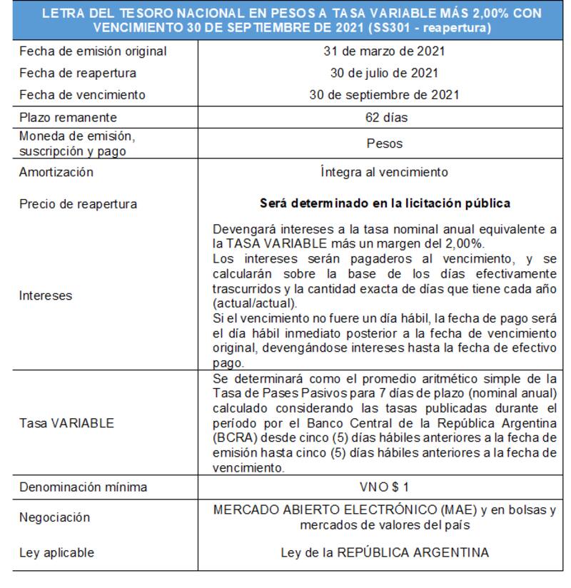 - b) Letra del Tesoro Nacional en pesos a tasa variable más 2% con vencimiento 30 de septiembre de 2021 (ss301 - reapertura);