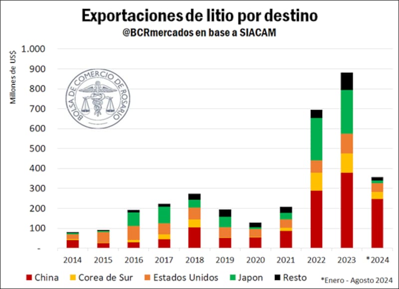 En este marco, mientras el año pasado el Japón representaba el 25% de las compras al complejo litio argentino, en lo que va del 2024 representa apenas el 4%. Por su parte, China pasó de demandar el 43% del litio exportado por Argentina en 2023, a representar el 69% del volumen enviado al exterior en los primeros ocho meses del 2024.