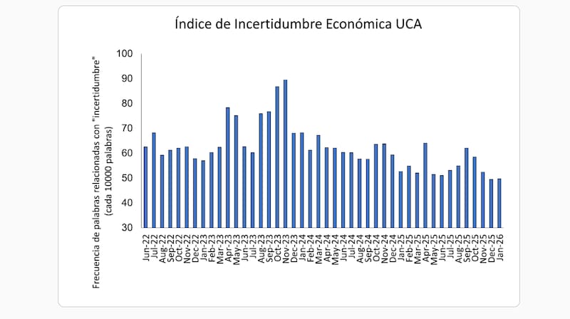 Según el más reciente informe mensual del Índice de Incertidumbre Económica UCA, elaborado por el Centro de Analítica Económica y Empresarial de la Universidad Católica Argentina (UCA), el valor de este índice se ubicó por debajo de los 50 puntos en enero de 2026, una marca que contrasta con las recientes mediciones históricamente elevadas registradas durante los últimos años en el país.