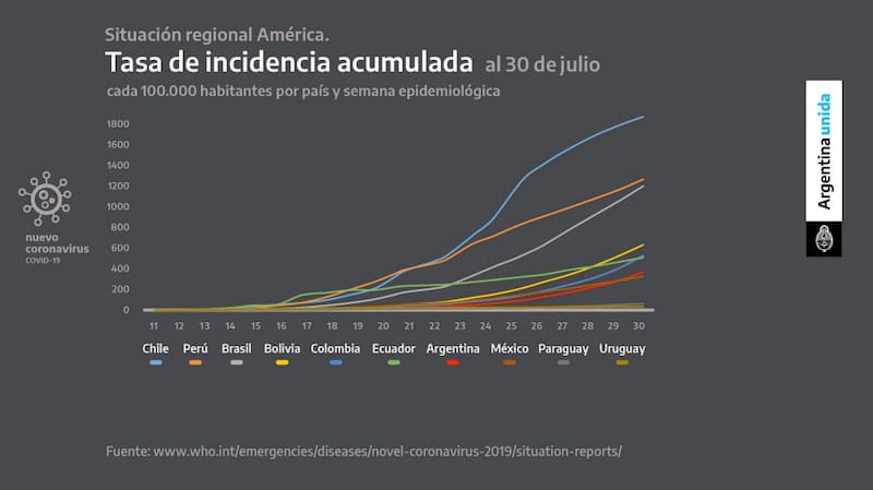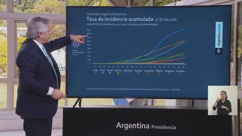 Al igual que en las nueve presentaciones previas, el mandatario; acompañado por el gobernador bonaerense, Axel Kicillof, y por el jefe de Gobierno porteño, Horacio Rodríguez Larreta; utilizó una serie de gráficos para mostrar la evolución y el paso del Covid-19 por el país, la región y el mundo. En esta ocasión, fueron 14 filminas.