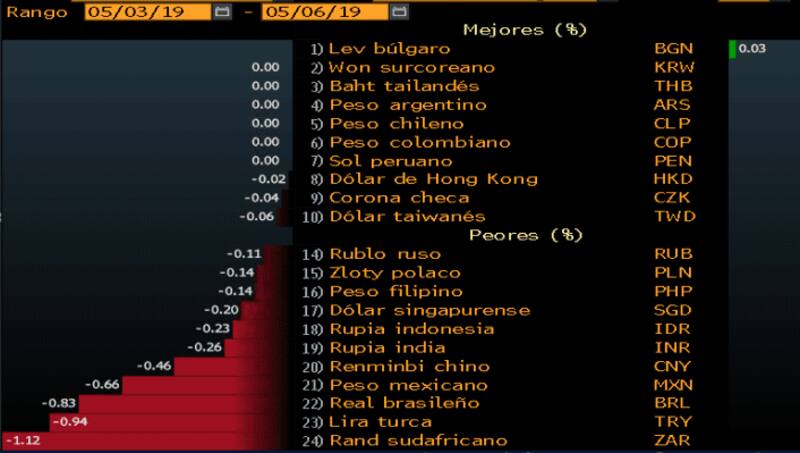 Las principales monedas emergentes se devaluaban hasta más de 1%. El mal día para emergentes ya golpea al peso argentino, que de por sí viene afectado por el mal clima económico interno y la volatilidad y tensión que generan la falta de deficiones respecto a las próximas elecciones.