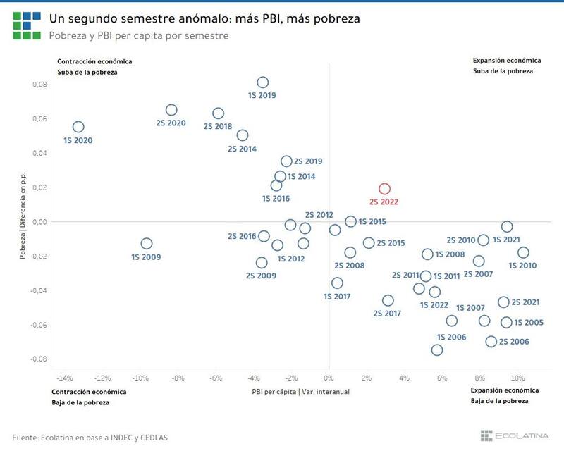 "El crecimiento que experimentó la economía a lo largo de 2022 (+5,2% i.a.) y la mejora en las estadísticas de empleo se sustentó sobre bases inestables: la creación de empleo informal y la contracción de los salarios en términos reales -en mayor medida del empleo de baja calidad- en un marco de inflación ascendente. Esta combinación de factores repercutió de forma directa sobre una tasa de pobreza, la cual muestra una preocupante tendencia ascendente en los últimos 7 años: pasó del 30,3% en el segundo semestre de 2016 al 39,2% actual", sintetiza Ecolatina, a la vez que prevé, para el primer semestre del 2023, que el panorama "se complejice más aún".