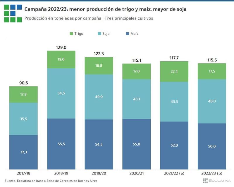 En el lanzamiento de la campaña gruesa, la Bolsa de Cereales de Buenos Aires (BCBA) proyectó un escenario de menor cosecha para la campaña 22/23 para los principales cinco cultivos, que pasaría de 117,7 M/Ton a 115,5 M/Ton (-1,9%), con caídas en trigo y maíz y una recuperación de la soja.