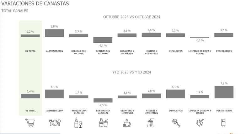 En el acumulado enero–octubre, las diferencias se acentuaron. “Alimentación” creció 5,1%, “Perecederos” alcanzó un incremento de 7,1%, “Impulsivos” avanzó 5,1%, “Higiene y cosmética” subió 2,8% y “Desayuno y merienda” aumentó 1,6%. Por el contrario, “Bebidas sin alcohol” retrocedió -2,5% y “Bebidas con alcohol” creció apenas 1,7%. “Limpieza de ropa y hogar” registró un alza moderada de 1,9%.