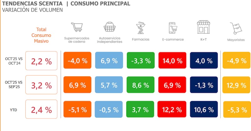 En ese contexto, los datos relevados por Scentia permiten observar con mayor claridad cómo se comportó el consumo masivo durante octubre y qué tendencias se consolidaron en cada canal y canasta.