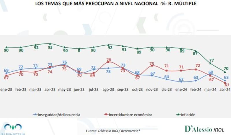 Las consultoras privadas estiman que el dato del Índice de Precios al Consumidor (IPC) de abril que publicará el INDEC volvería a ser de un dígito. En línea con esos análisis, las personas muestreadas manifestaron un notable descenso de 7 puntos en un mes al respecto de su preocupación por la inflación. Esto se plasma incluso en otros puntos: el temor a la inseguridad bajó 5 puntos y la incertidumbre económica 6 puntos.