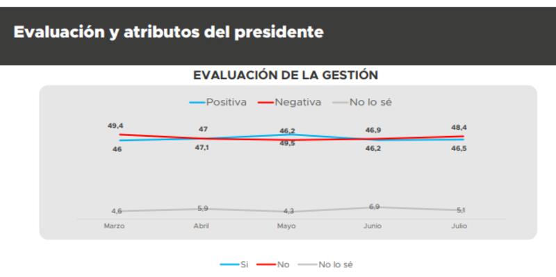 "Javier Milei está más cerca del 45% positivo que del 50% durante julio y se registró una caída en su imagen, valoración de gestión y principales atributos del presidente", detallaron desde la consultora que realizó la encuesta.