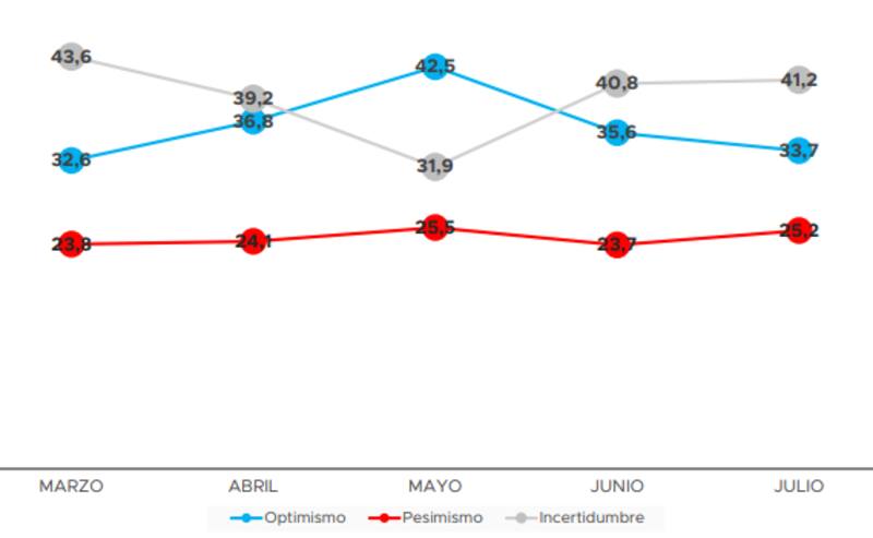 Por último, la respuesta "incertidumbre" se impuso por segunda encuesta consecutiva en el apartado "¿Qué sensación le genera el rumbo del país?", con una baja del optimismo y una estabilización del pesimismo que detectó el informe.