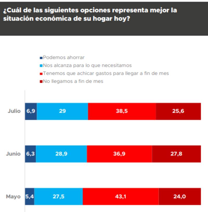 Ante la consulta "¿Cuál de las siguientes opciones representa mejor la situación económica de su hogar hoy?", el 38,5% aseguró que deben achicar gastos para llegar a fin de mes (creció dos puntos desde el mes anterior) y un 25,6% reveló que directamente no le alcanzan sus ingresos.