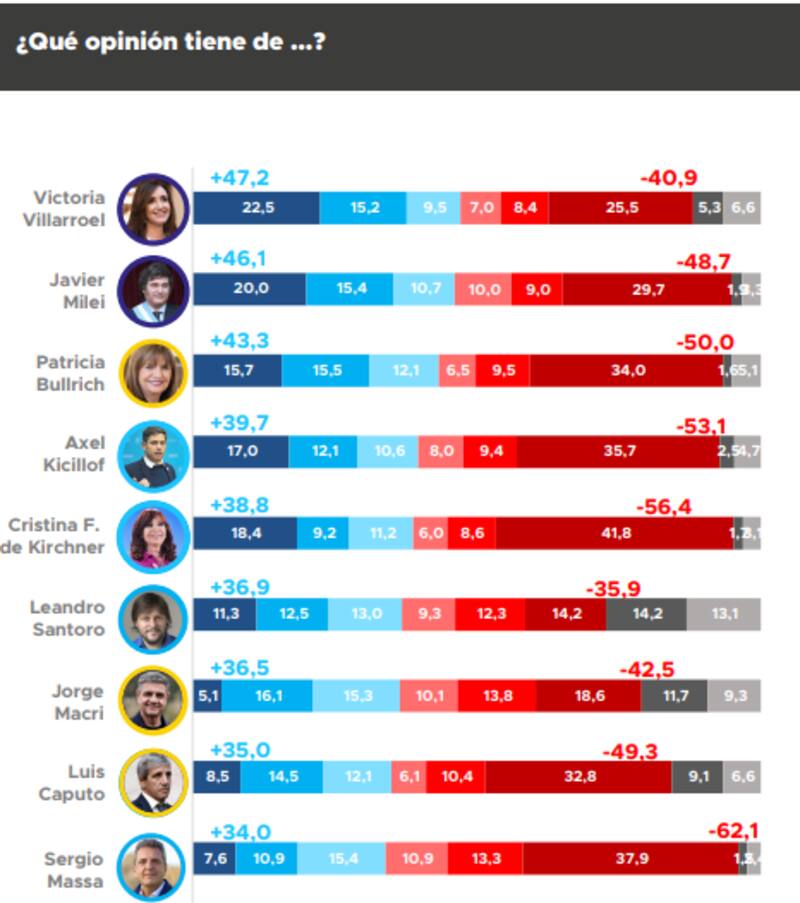 Además, la compañera de fórmula con la que el Milei tuvo cruces durante la última semana, Victoria Villarruel, es la figura política con mejor imagen del país, por arriba del propio Presidente y la única con diferencial a su favor entre la consideración positiva y la negativa.