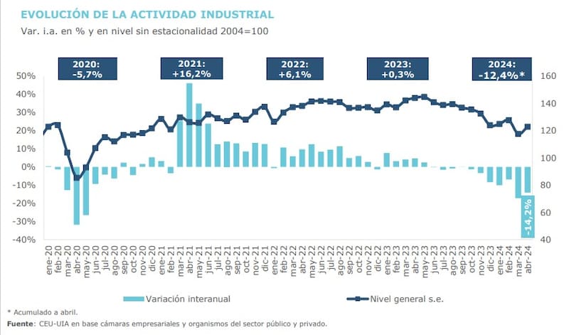 El último informe del Centro de Estudios de la UIA ilustra una baja en todos los rubros que componen el índice que monitorea mes a mes la marcha de la actividad manufacturera. Los mayores desplomes se dieron en el rubro de los Minerales no metálicos (-34,1% interanual), relacionado con la construcción, y el sector Automotor (-21% i.a.). También cayó la Metalmecánica (-19,5% i.a.) y Metales básicos (-16,7% i.a.).