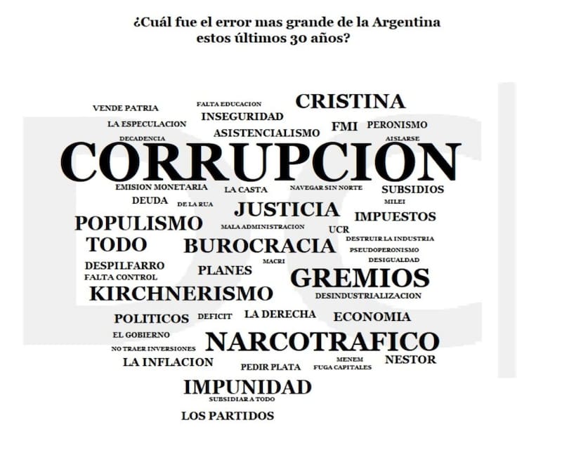 El relevamiento también preguntó sobre el principal error de la Argentina en los últimos 30 años. Entre los conceptos que afloraron con más intensidad figuran "el populismo, la justicia, la burocracia, Cristina (Fernández de Kirchner", pero el principal es "la corrupción". No es casual que el gobierno libertario haya elegido el concepto-idea como su nueva bandera política
